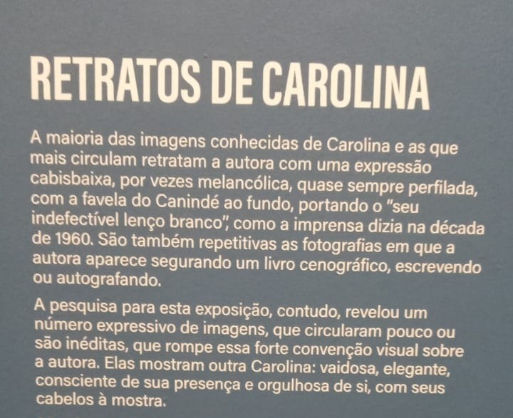 A exposição conta parte da vida da autora e traz à luz talentos e aspectos dela que nem todos conhecem. Além de escritora também era cantora, compositora e poeta. São mais de 400 itens entre livros, manuscritos e fotografias, além de trabalhos de artistas que dialogam com a vida e obra de Carolina Maria de Jesus.